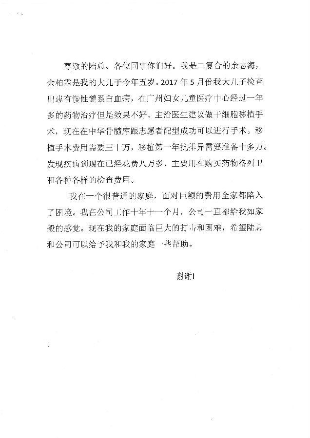 余志海是我們公司二復合生產線的一名普通員工,2007年月份加入新文塑料大家庭。作為一名普通員工,在工作期間,他工作誠懇熱情、勤奮敬業、積極上進。在生活中,他是一位好丈夫,好父親。然而天有不測風云,2017年5月他家年僅4歲的大兒子余柏霖因發燒感冒住院,經檢查確診為:慢性髓系白血病,BCR/ABL陽性。