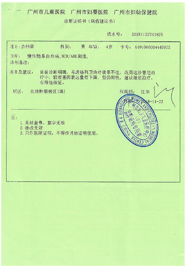 目前,孩子正在廣州市婦女兒童醫療中心接受治療,主治醫生建議做干細胞移植手術。很幸運現已在中華骨髓庫跟志愿者配型成功,可以進行干細胞移植手術。但是移植手術費用需要30萬元,術后第1年搞排異治療亦高達10萬多元。
